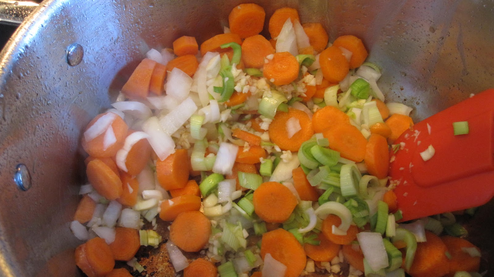 Add onion, leek, carrots and garlic to the same pan. Cook until onion starts to soften, about 3 min.